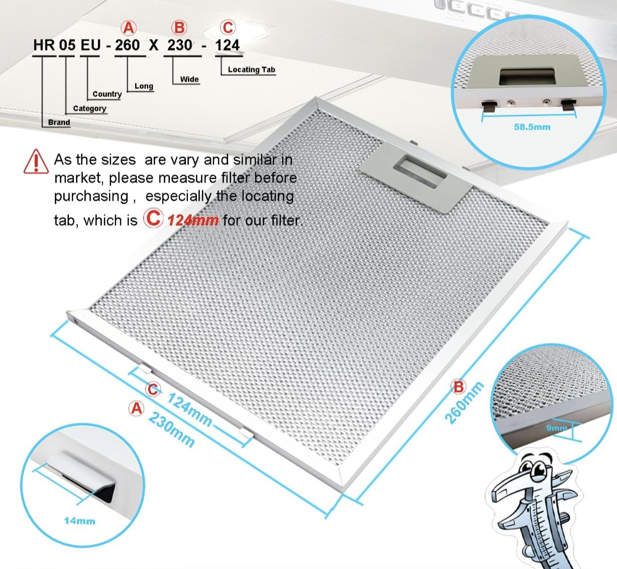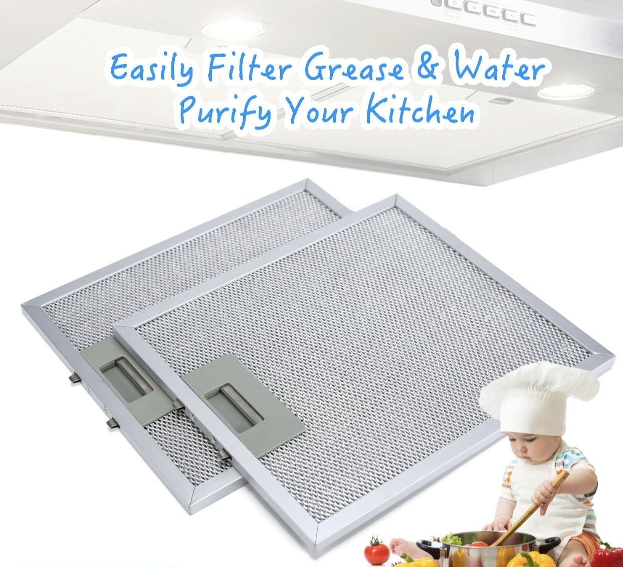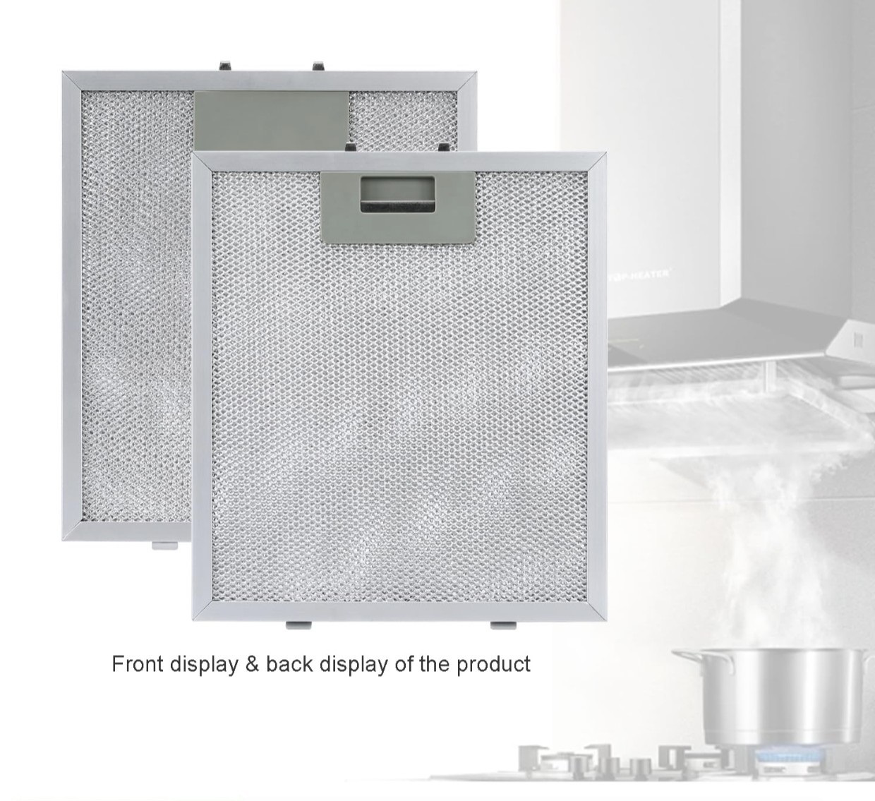Cấu tạo: lưới nhôm, ngoài bo viền cứng, có cơ cấu gài vào hút mùi giúp cho việc tháo lắp dễ dàng.
